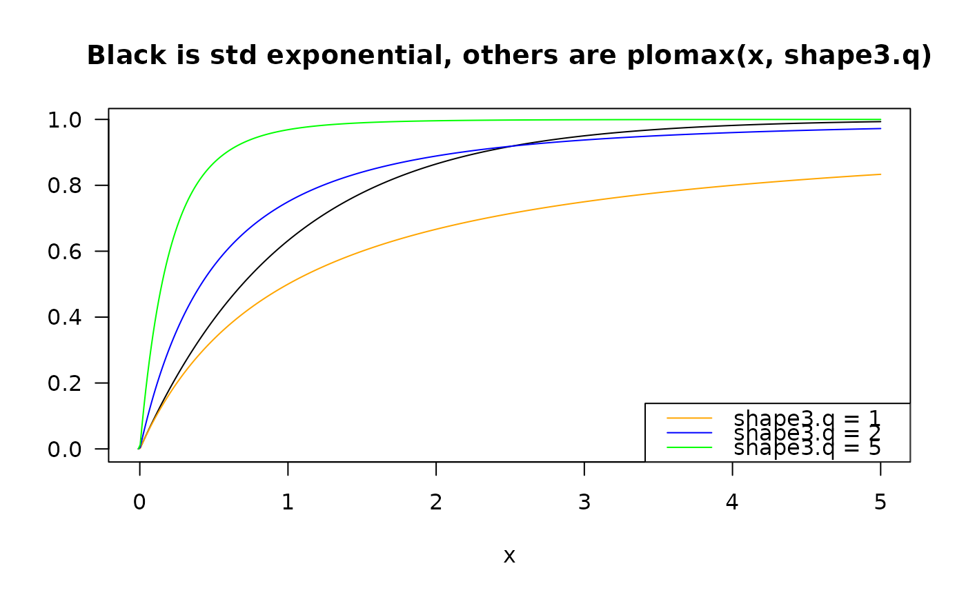 main = "Black is std exponential, others are plomax(x, shape3.q)")