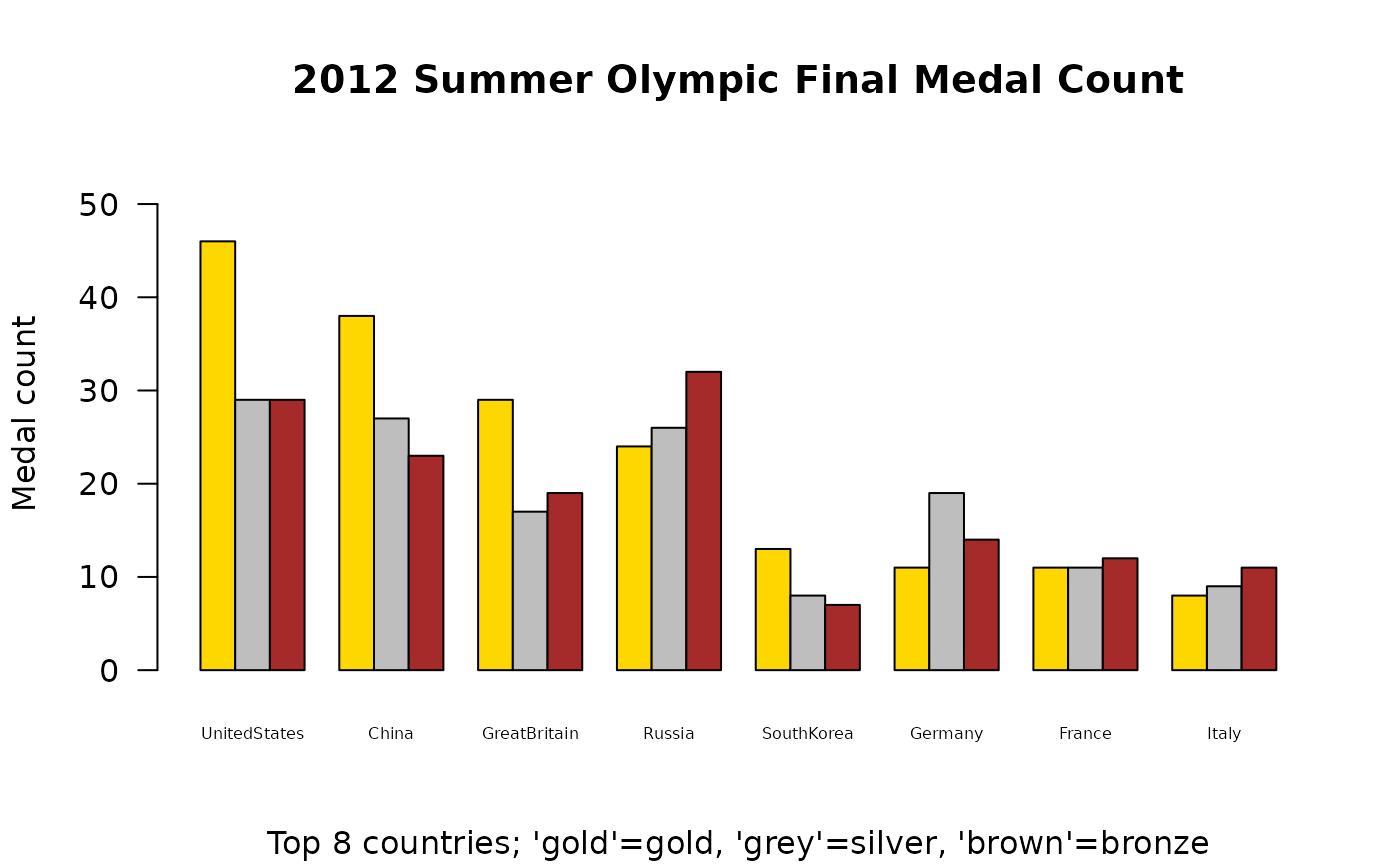 beside = TRUE, main = "2012 Summer Olympic Final Medal Count",