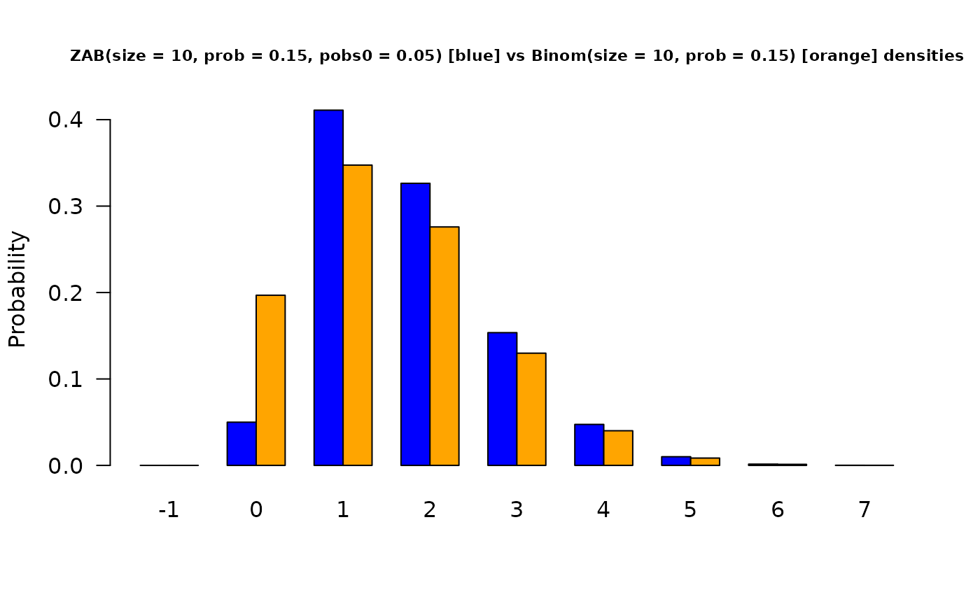 barplot(rbind(dzabinom(x, size = size, prob = prob, pobs0 = pobs0),