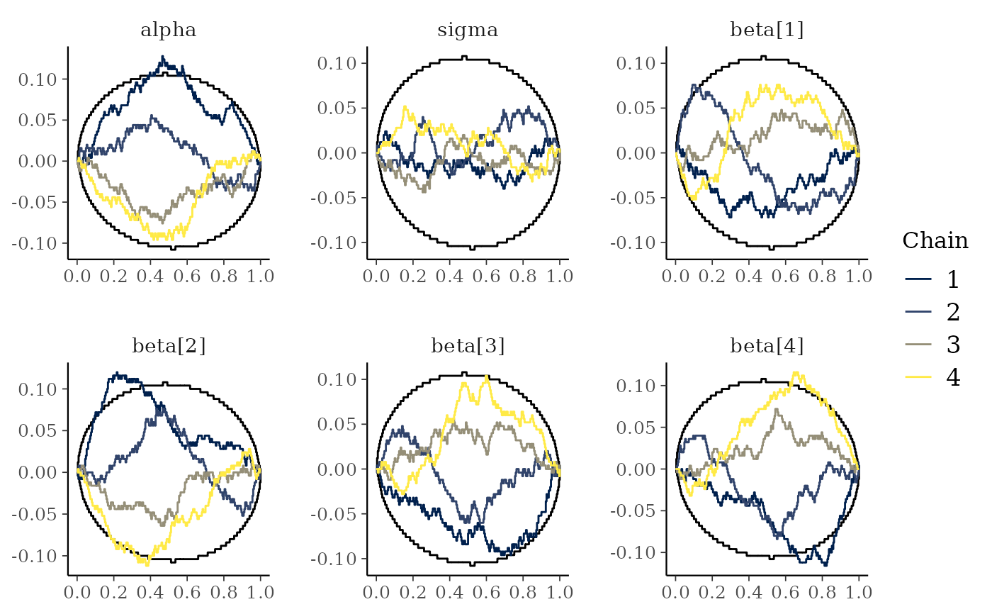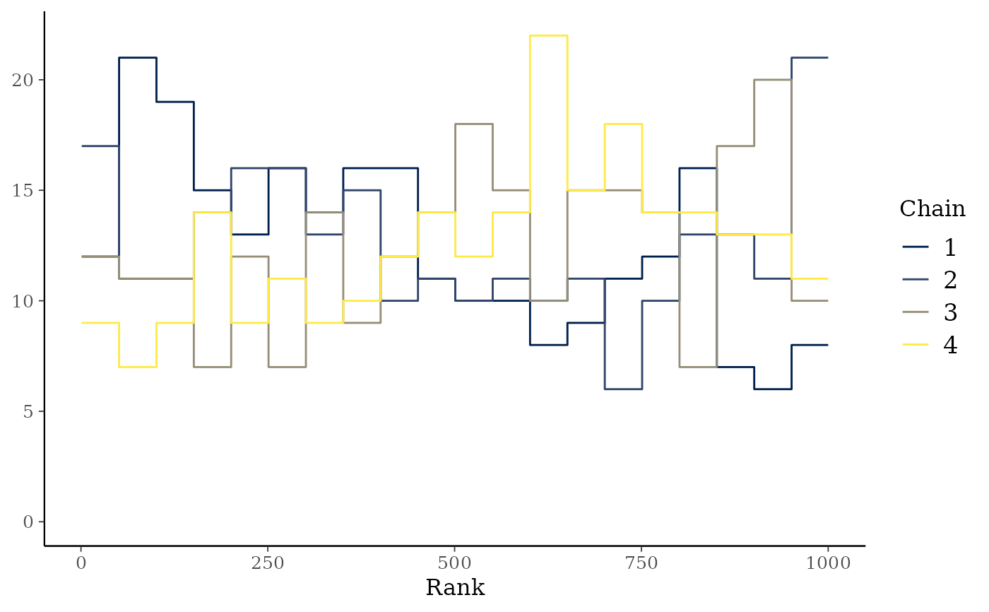 mcmc_rank_overlay()Ranks from mcmc_rank_hist() are plotted using overlaid lines in a