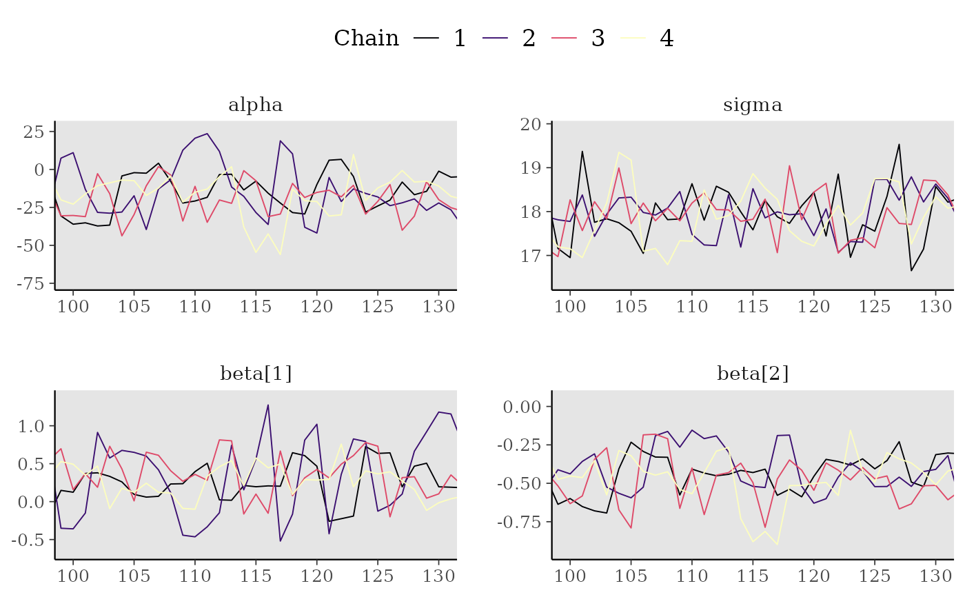 mcmc_trace(x[,, 1:4], window = c(100, 130), size = 1) +