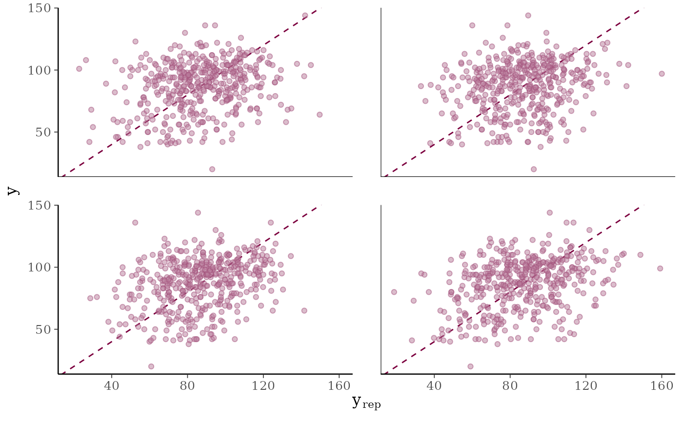 p2 <- ppc_scatter(y, yrep[20:23, ], alpha = 0.5, size = 1.5)