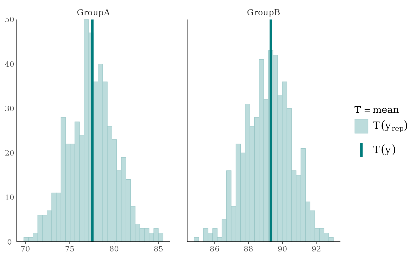 NOTE: Although the default test statistic is the mean, this is unlikely to detect anything interesting in most cases. In general we recommend using some other test statistic as discussed in Section 5 of Gabry et al. (2019).