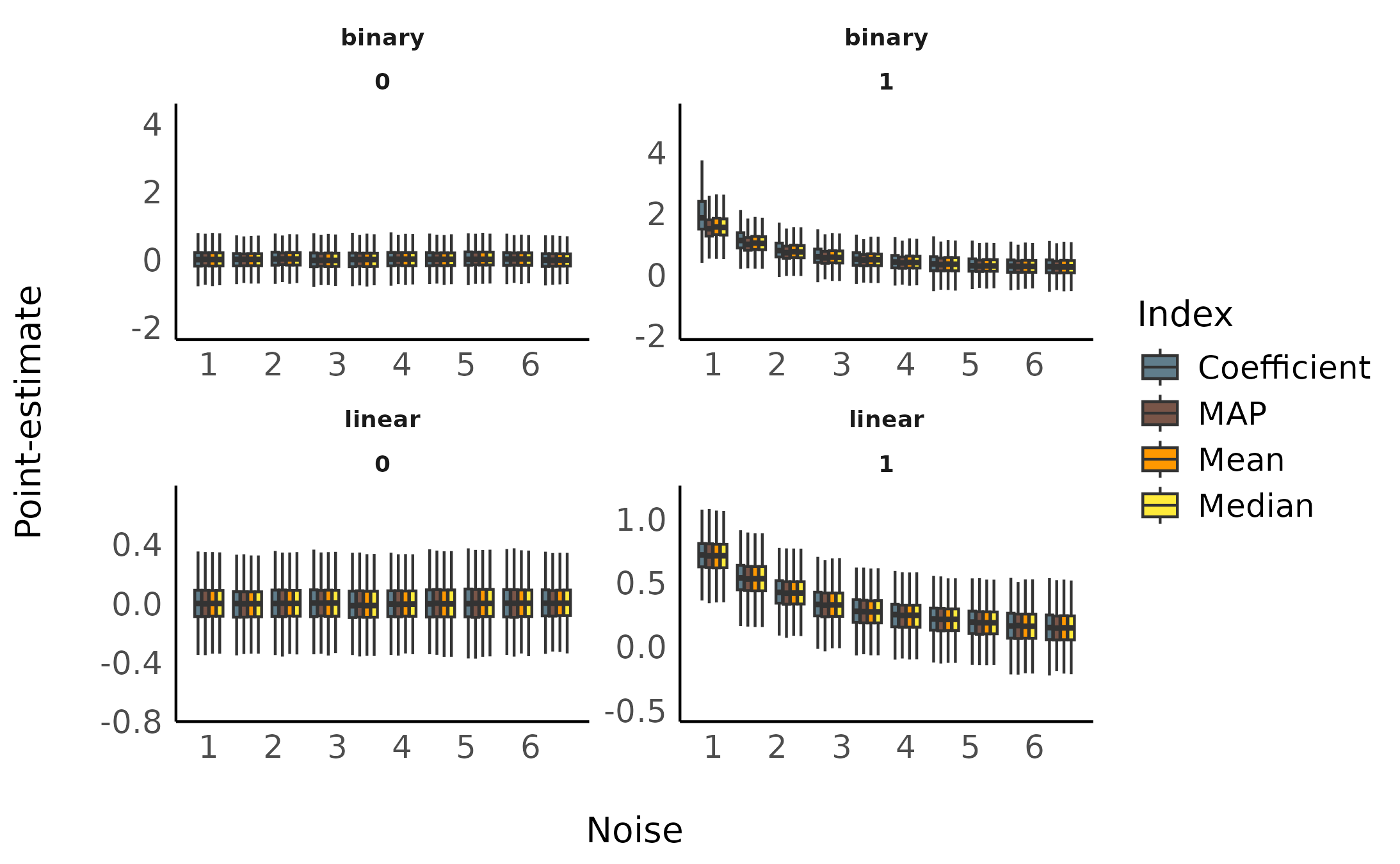 values = c("Coefficient" = "#607D8B", "MAP" = "#795548", "Mean" = "#FF9800", "Median" = "#FFEB3B"),