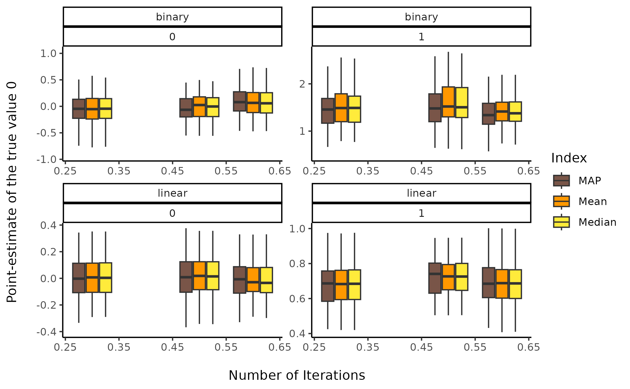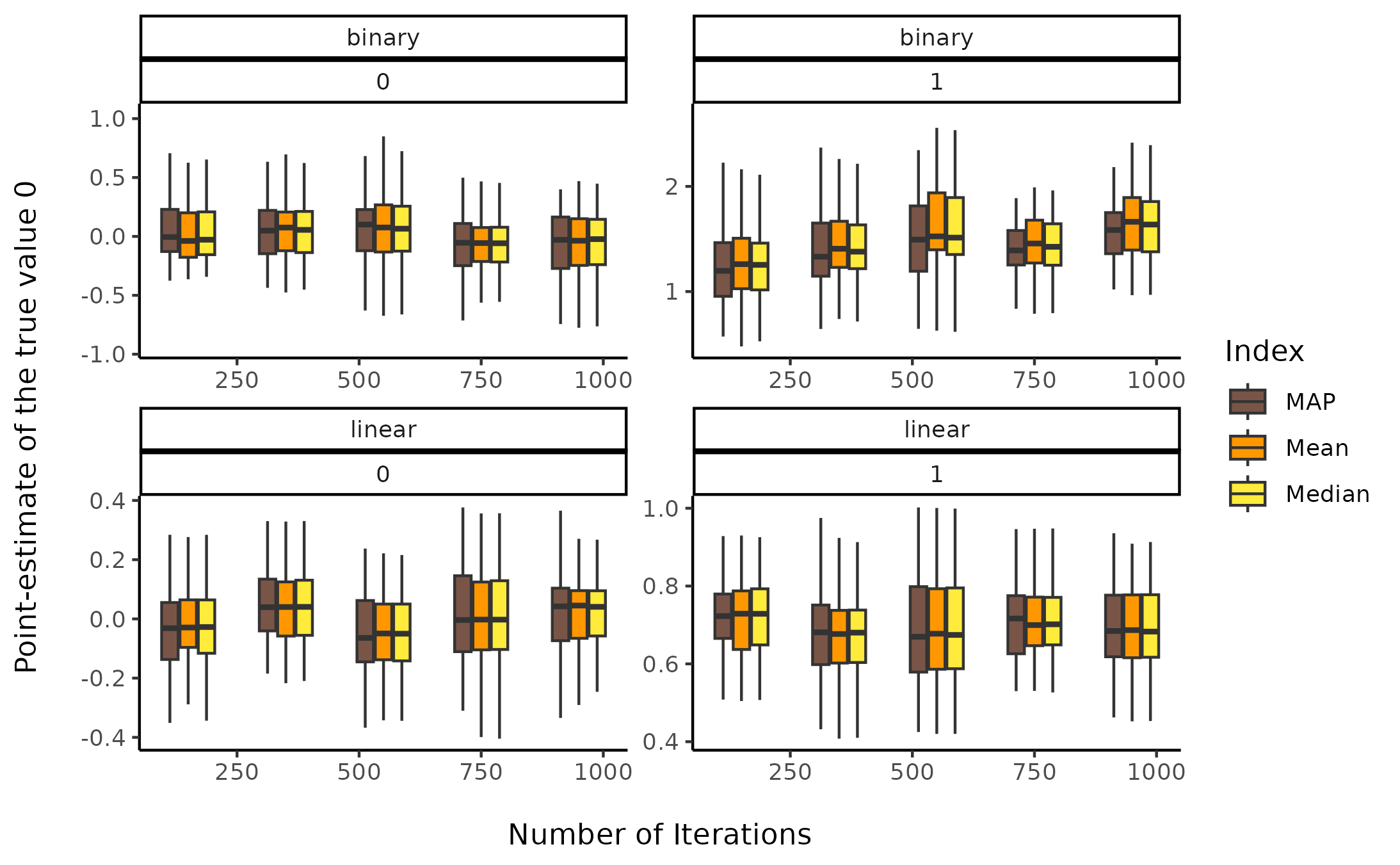 dat <- data_select(dat, select = c("iterations", "true_effect", "outcome_type", "beta", "Median", "Mean", "MAP"))