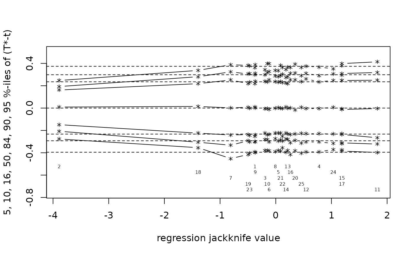The plot will consist of a number of horizontal dotted lines which correspond to the quantiles of the centred bootstrap distribution. For each data point the quantiles of the bootstrap distribution calculated by omitting that point are plotted against the (possibly standardized) jackknife values. The observation number is printed below the plots. To make it easier to see the effect of omitting points on quantiles, the plotted quantiles are joined by line segments. These plots provide a useful diagnostic tool in establishing the effect of individual observations on the bootstrap distribution. See the references below for some guidelines on the interpretation of the plots.