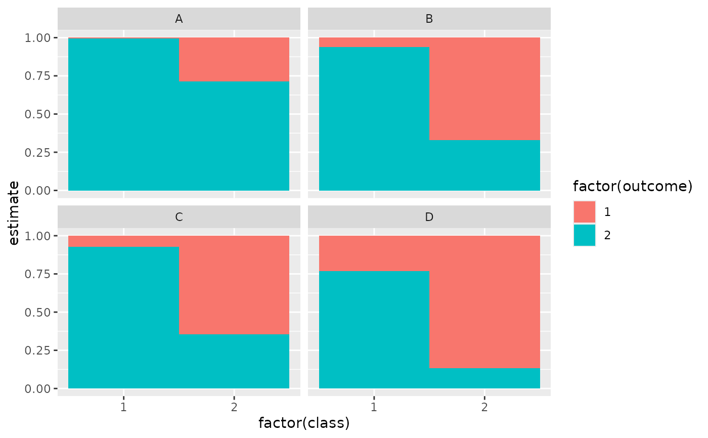 ggplot(tidy(M1), aes(factor(class), estimate, fill = factor(outcome))) +