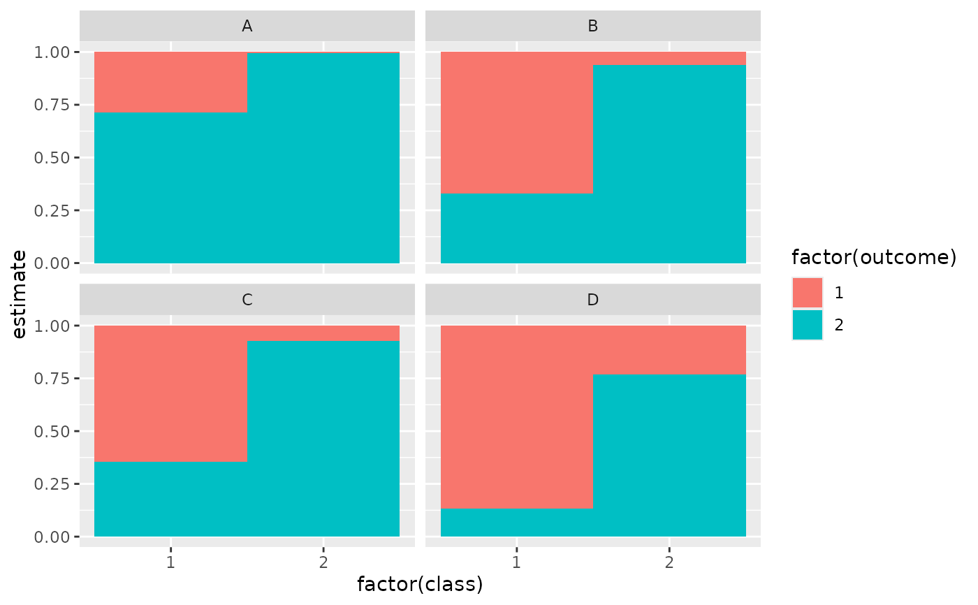 ggplot(tidy(M1), aes(factor(class), estimate, fill = factor(outcome))) +