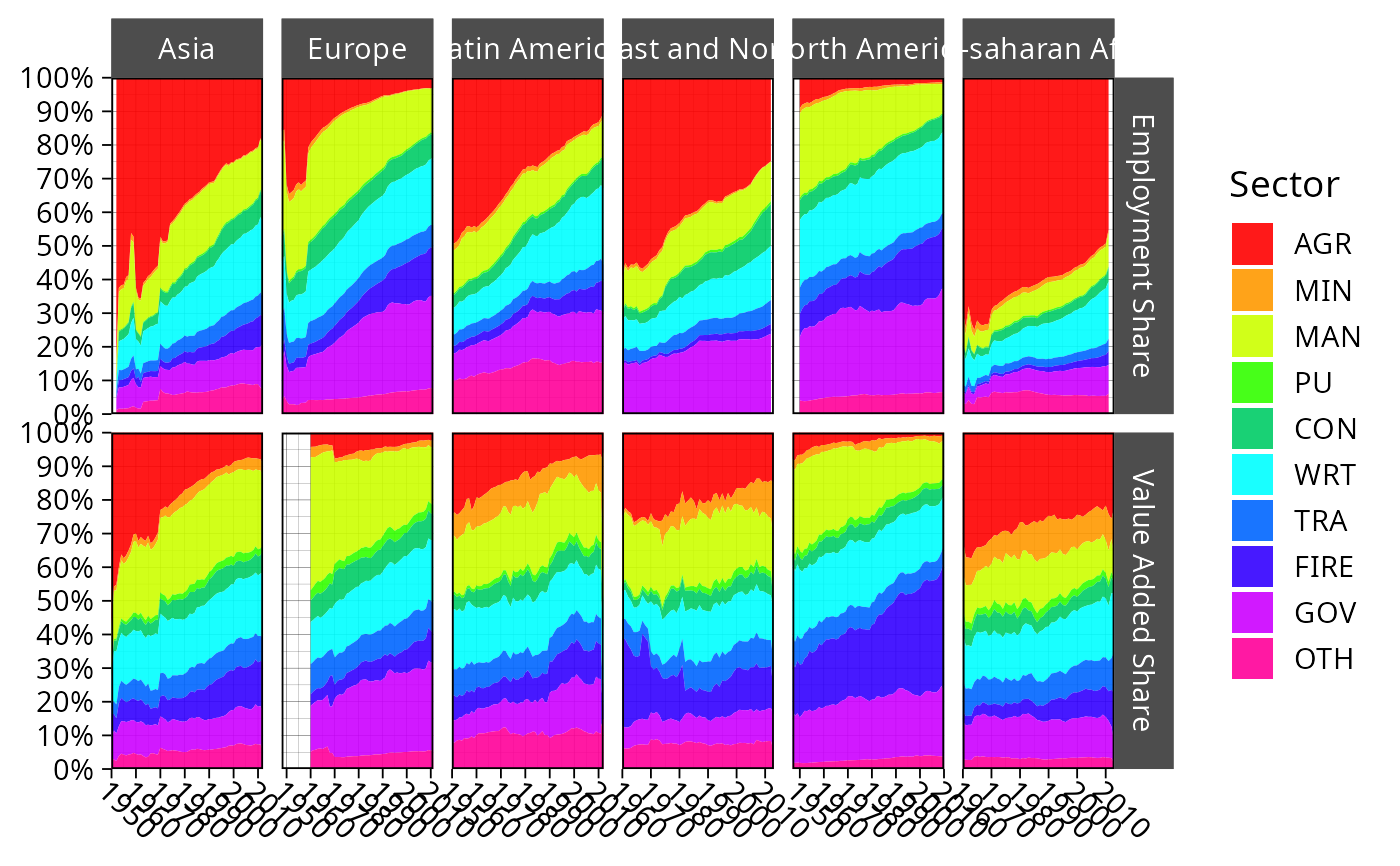 GGDC10S.RdThe GGDC 10-Sector Database provides a long-run internationally comparable dataset on sectoral productivity performance in Africa, Asia, and Latin America. Variables covered in the data set are annual series of value added (in local currency), and persons employed for 10 broad sectors.