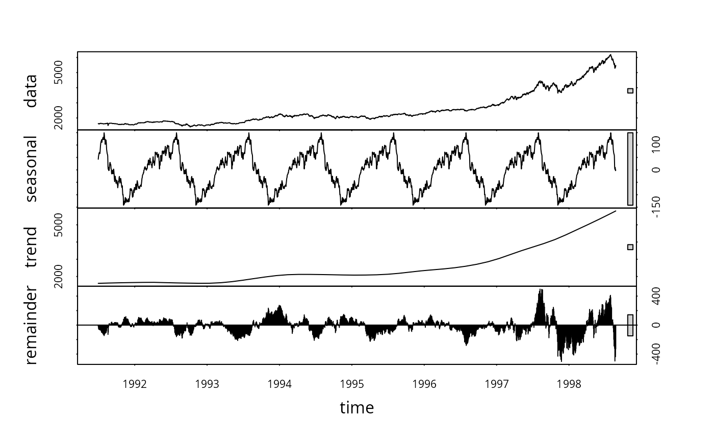 plot(stl(EuStockMarkets[,"DAX"], freq)) # There is some obvious seasonality
