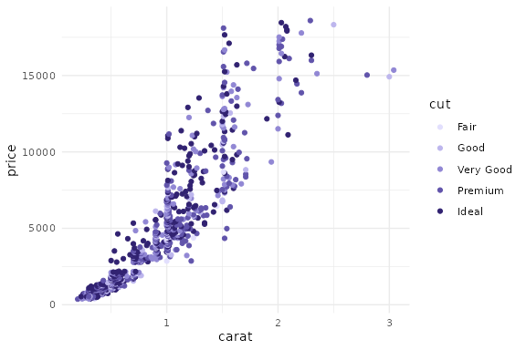 And for the second example the sequential palette is used to code the cut levels in a scatter of price by carat in the diamonds data (or rather a small subsample thereof). The scale function first generates six colors but then drops the first color because the light gray is too light here. (Alternatively, the chroma and luminance parameters could also be tweaked.)