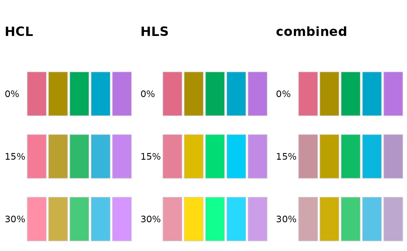 If space = "combined", the colors are first adjusted in both the HCL and HLS spaces. Then,