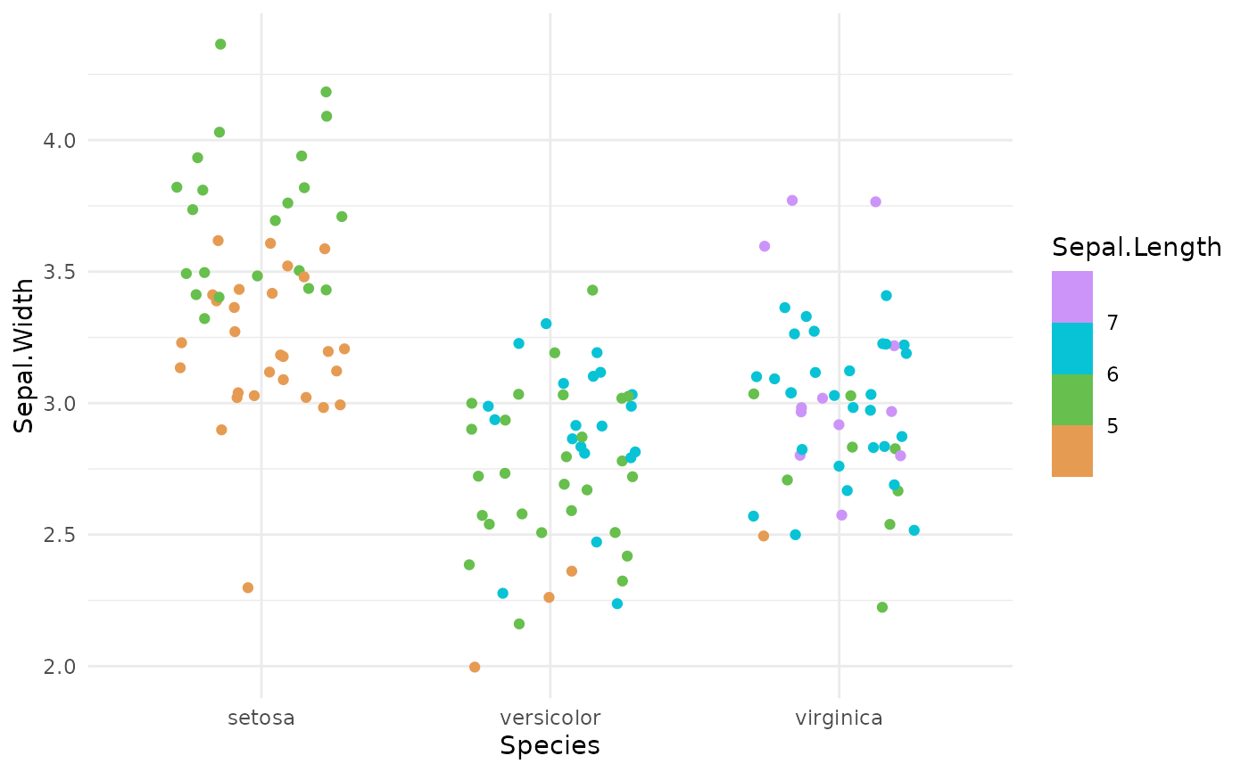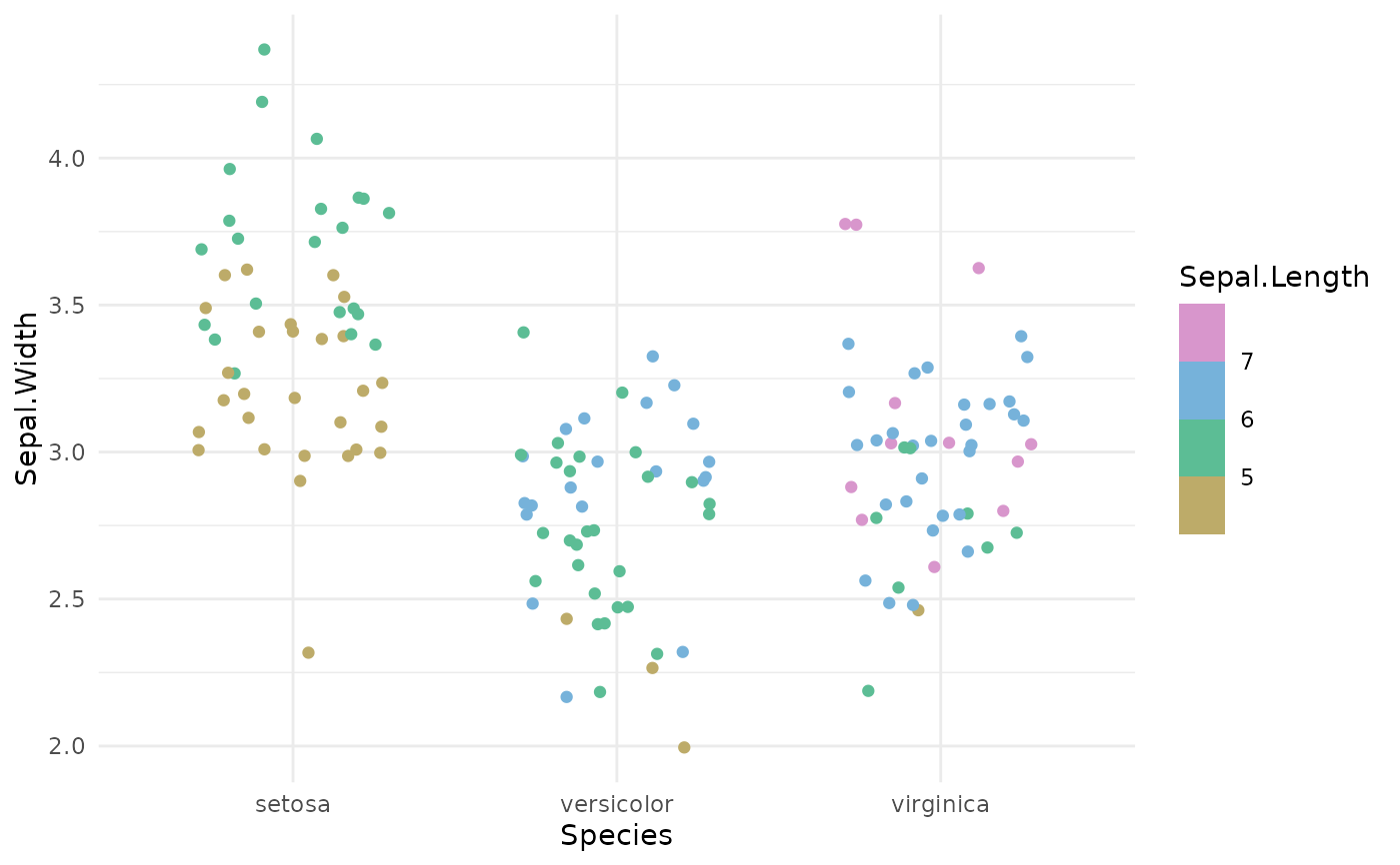 gg <- ggplot(iris, aes(x = Species, y = Sepal.Width, color = Sepal.Length)) +