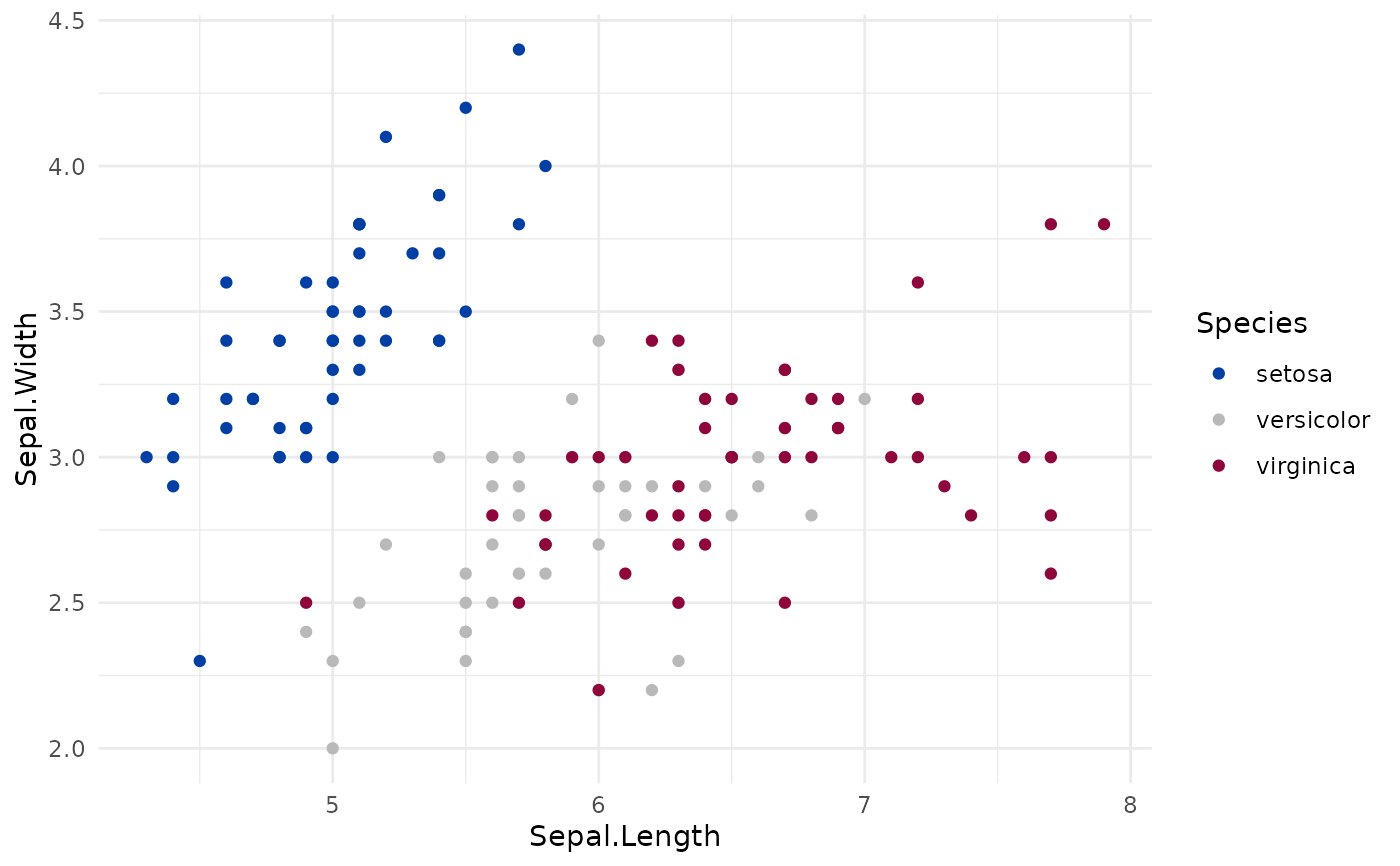 ggplot(iris, aes(Sepal.Length, Sepal.Width, color = Species)) +