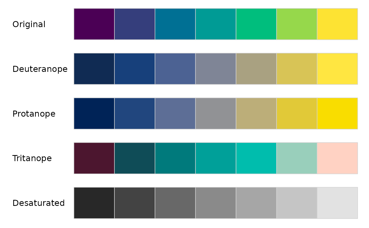 swatchplot(sequential_hcl(7, "Viridis"), cvd = TRUE)