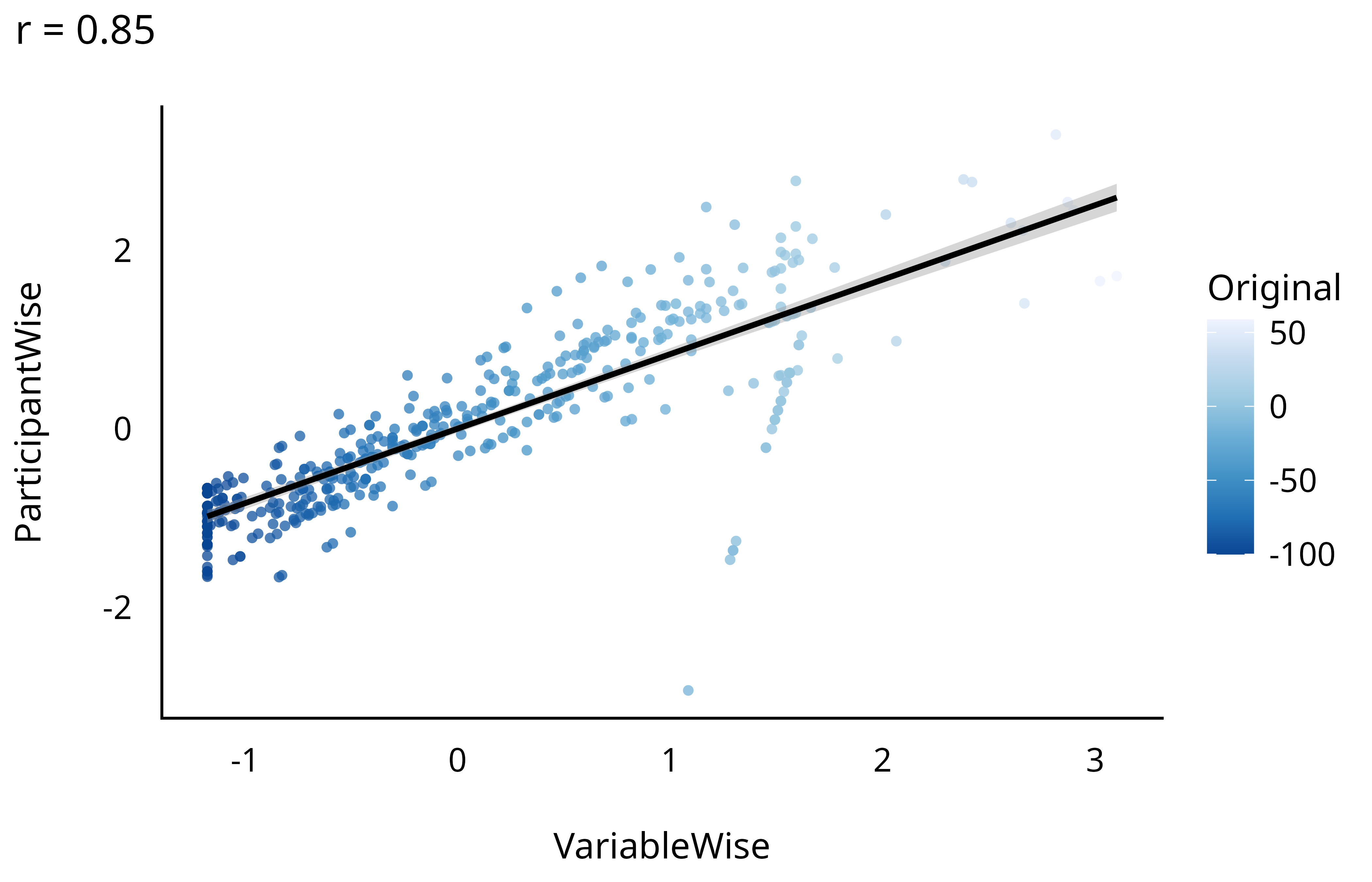 Let’s do a correlation between the variable-wise and participant-wise methods.