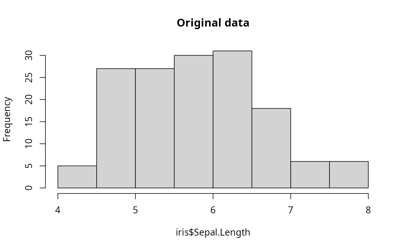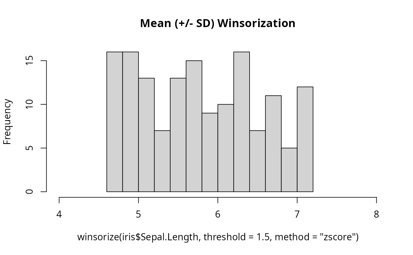 hist(winsorize(iris$Sepal.Length, threshold = 1.5, method = "zscore", robust = TRUE),