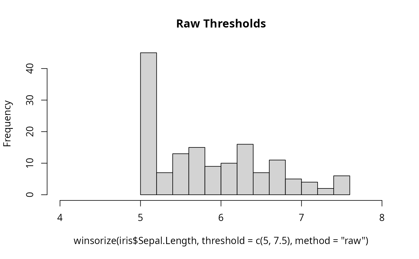 hist(winsorize(iris$Sepal.Length, threshold = c(5, 7.5), method = "raw"),