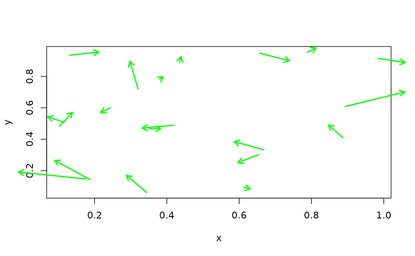 arrow.plot( x,y,u,v, arrow.ex=.2, length=.1, col='green', lwd=2)