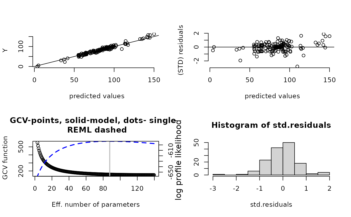 The second plot is "standardized" residuals against predicted value. Here we mean that the residuals are divided by the GCV estimate for tau and multiplied by the square root of any weights that have been specified. In the case of a "correlation model" the residuals are also divided by the marginal standard deviation from this model.