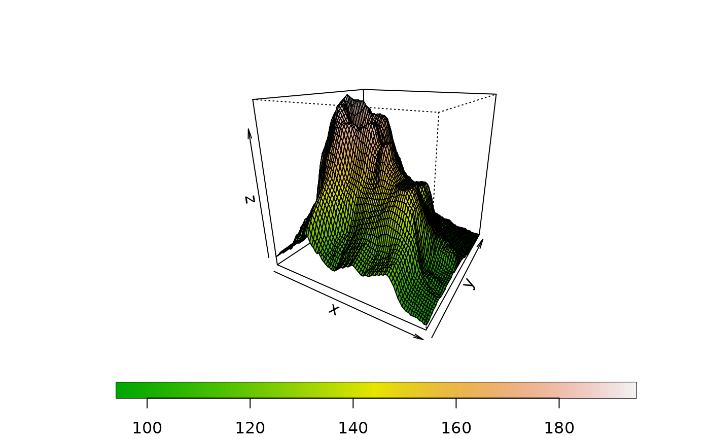 drape.plot( x,y,volcano, col=terrain.colors(128))-> pm