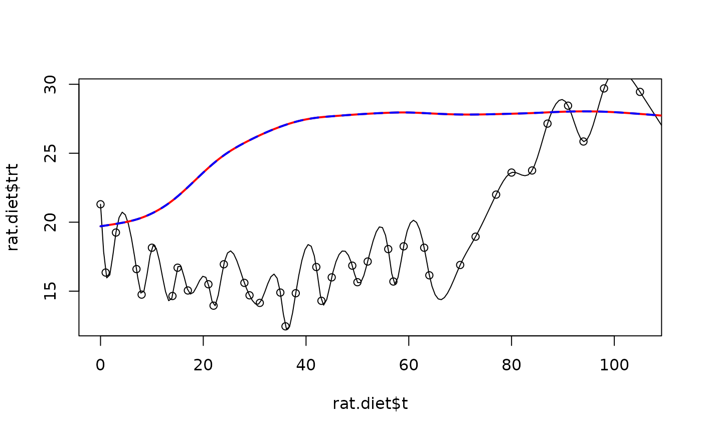 splint( rat.diet$t, rat.diet$con,x, df= 7)-> y1