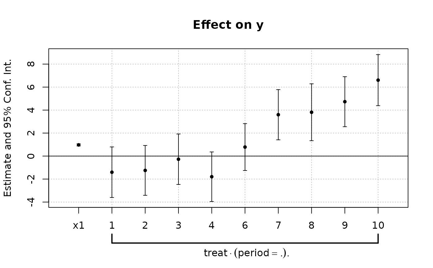 est_did = feols(y ~ x1 + i(period, treat, 5) | id+period, base_inter)