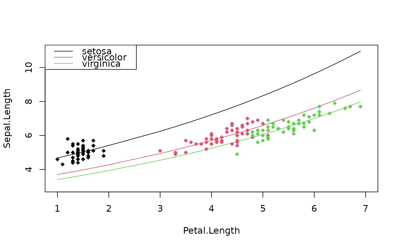 lines(newdata$Petal.Length, predict(res, newdata), col=3)