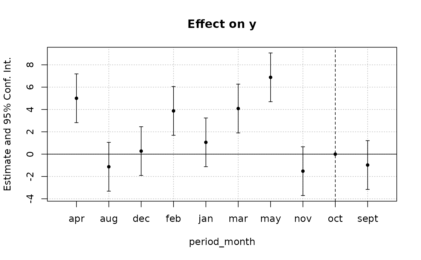 est = feols(y ~ x1 + i(month_factor, treat, "oct") | id + period, base_inter)