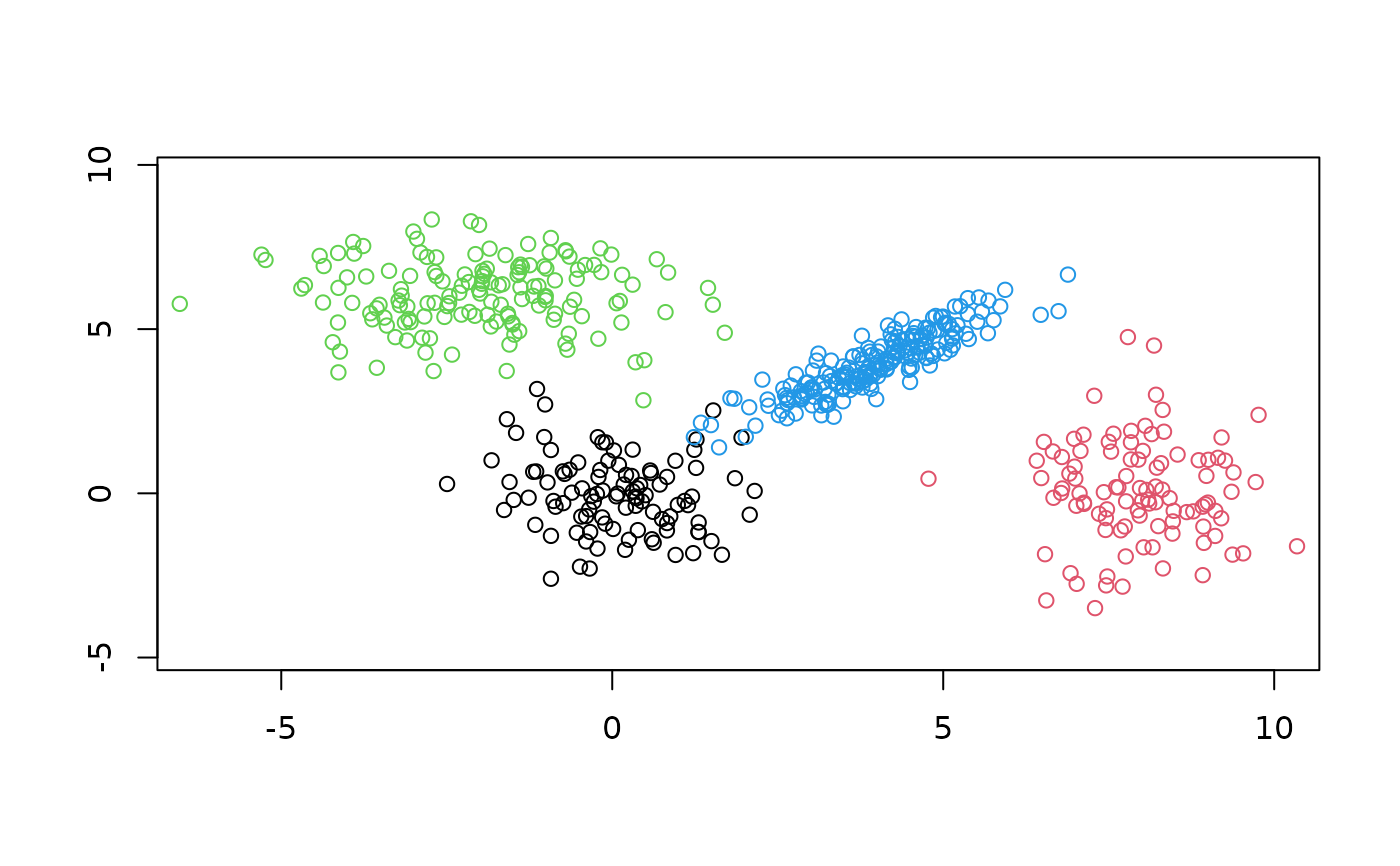 ExNclus.RdA simple artificial example for normal clustering with 4 latent classes, all of them having a Gaussian distribution. See the function definition for true means and covariances.