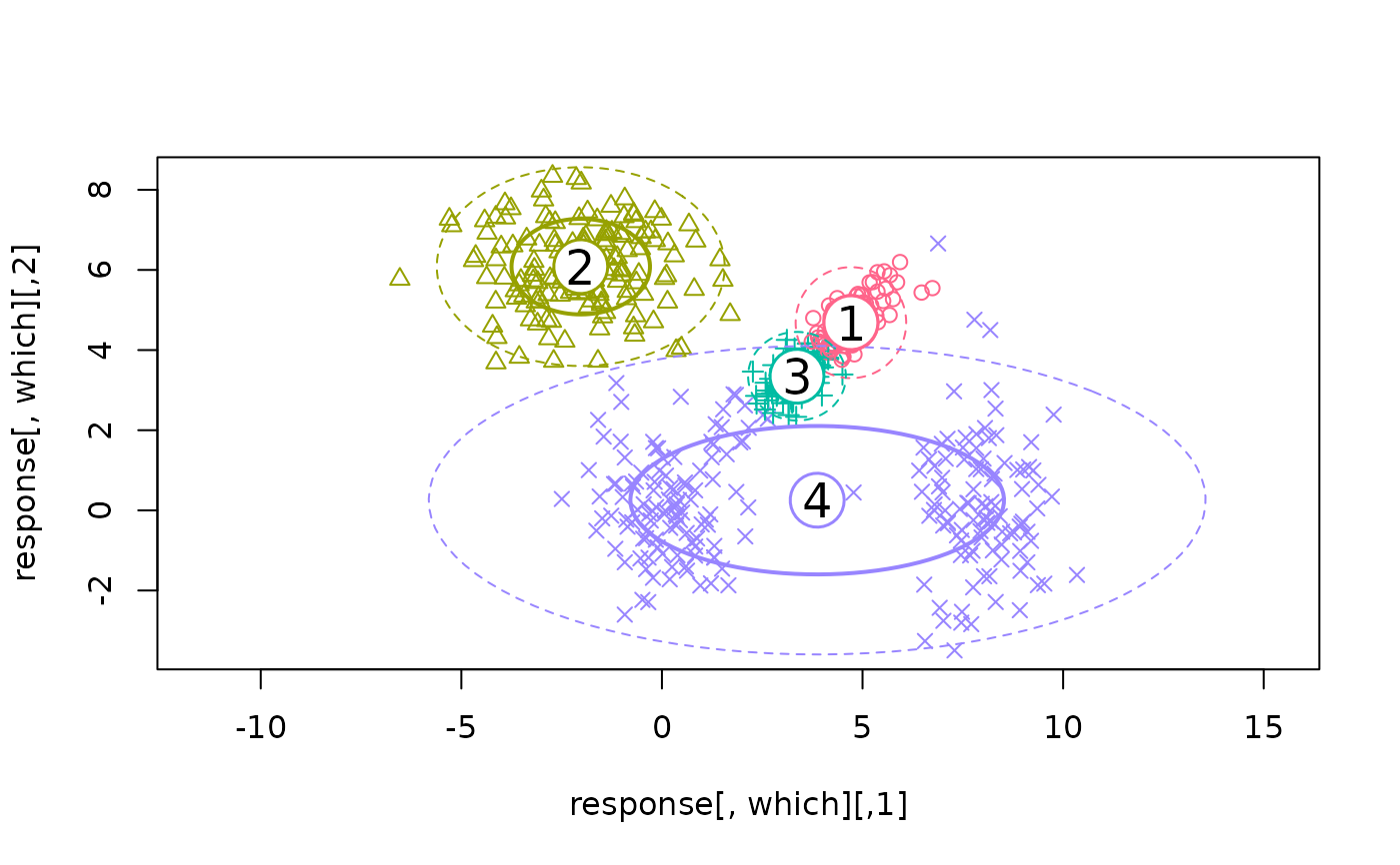 #> flexmix(formula = Nclus ~ 1, k = 4, model = FLXMCmvnorm())