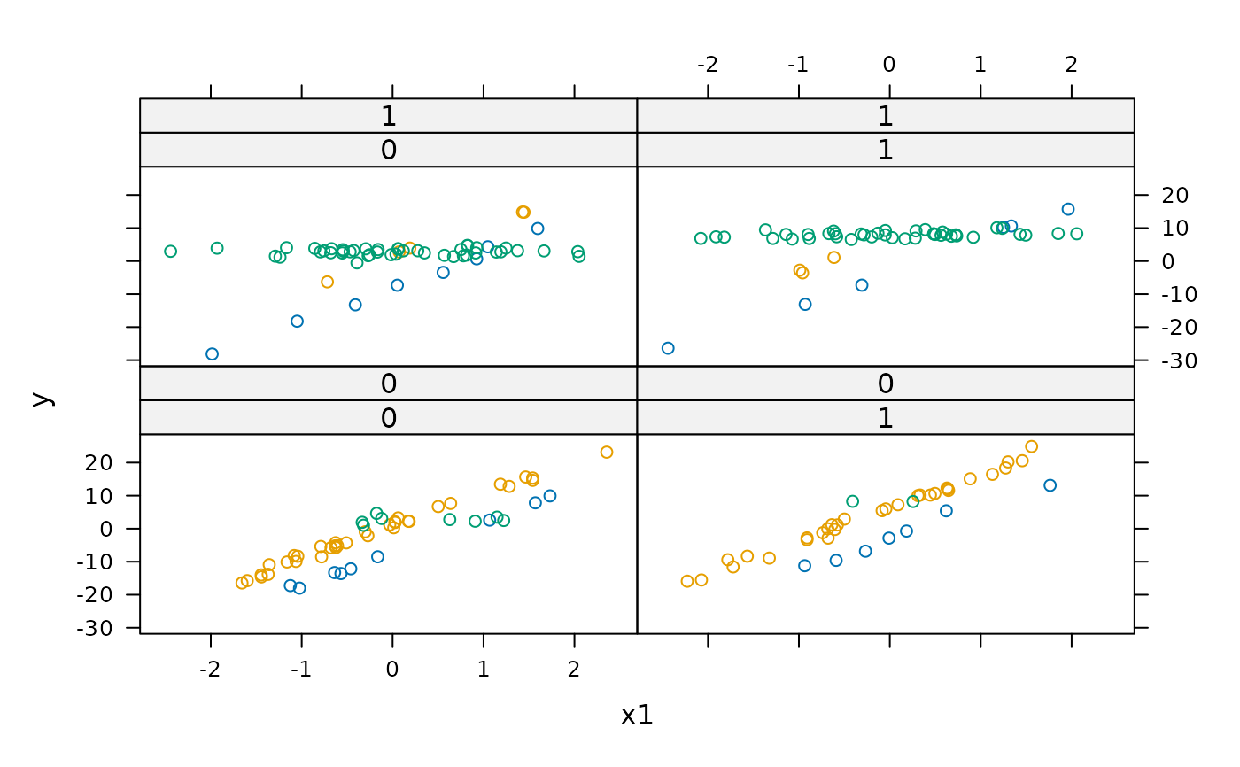 xyplot(y ~ x1 | x2 * w, data = NregFix, groups = class)