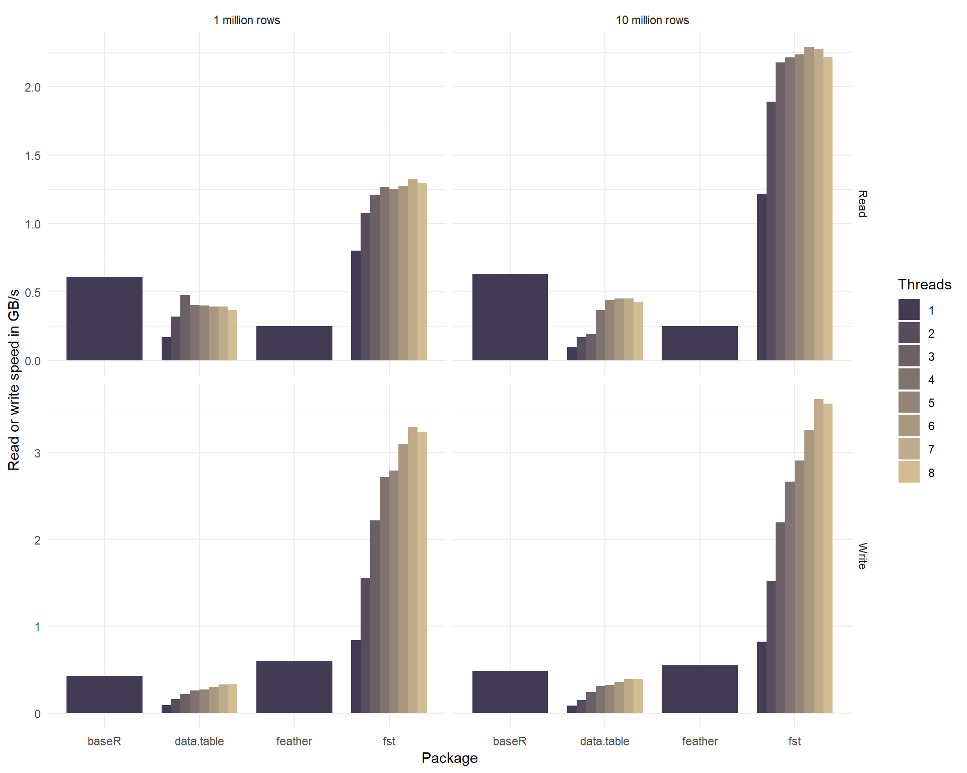 write_fst(df, "dataset.fst", 100) # use maximum compressionCompression reduces the size of the fst file that holds your data. But because the (de-)compression is done on background threads, it can increase the total read- and write speed as well. The graph below shows how the use of multiple threads enhances the read and write speed of our sample dataset.