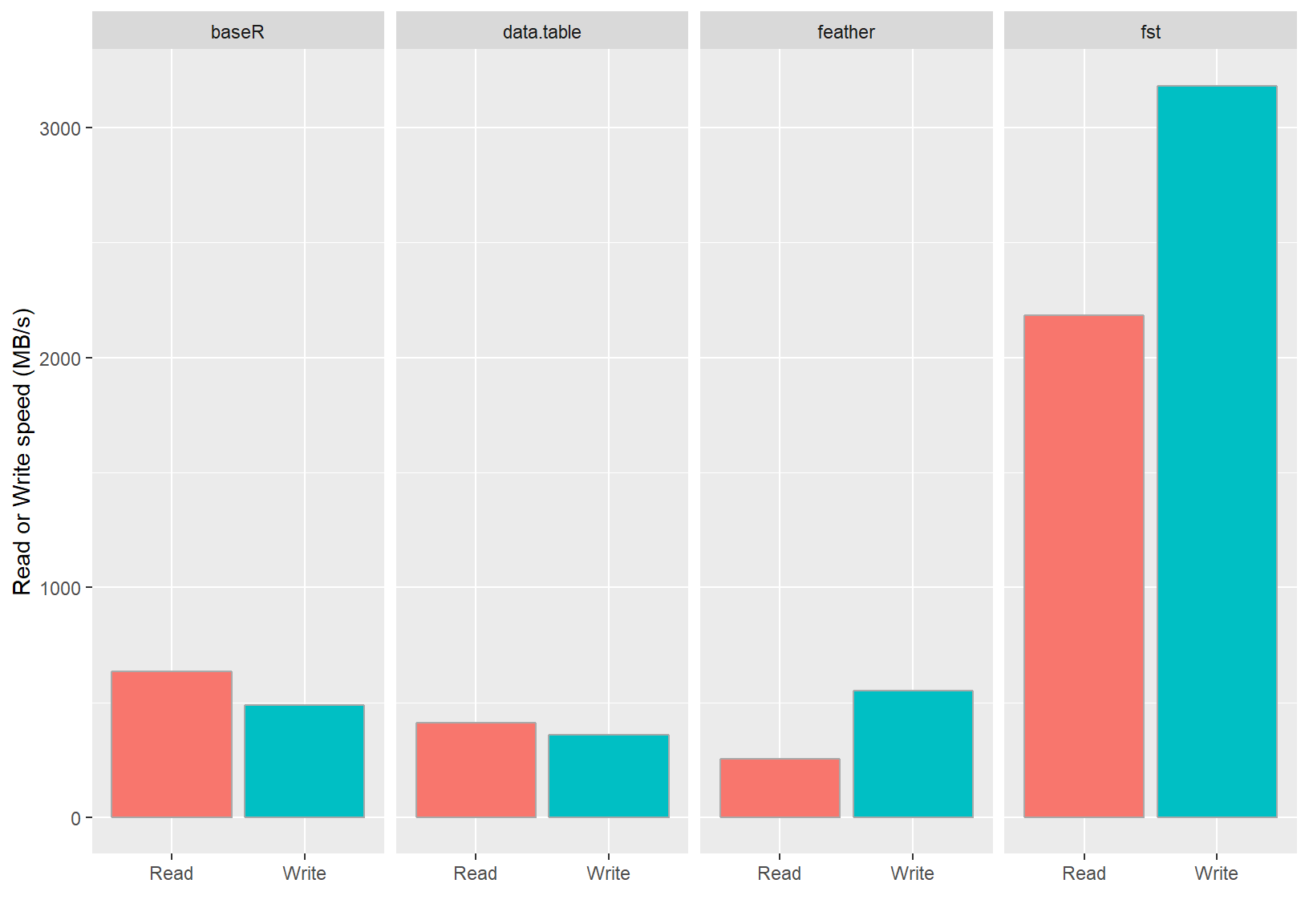 The figure below compares the read and write performance of the fst package to various alternatives.