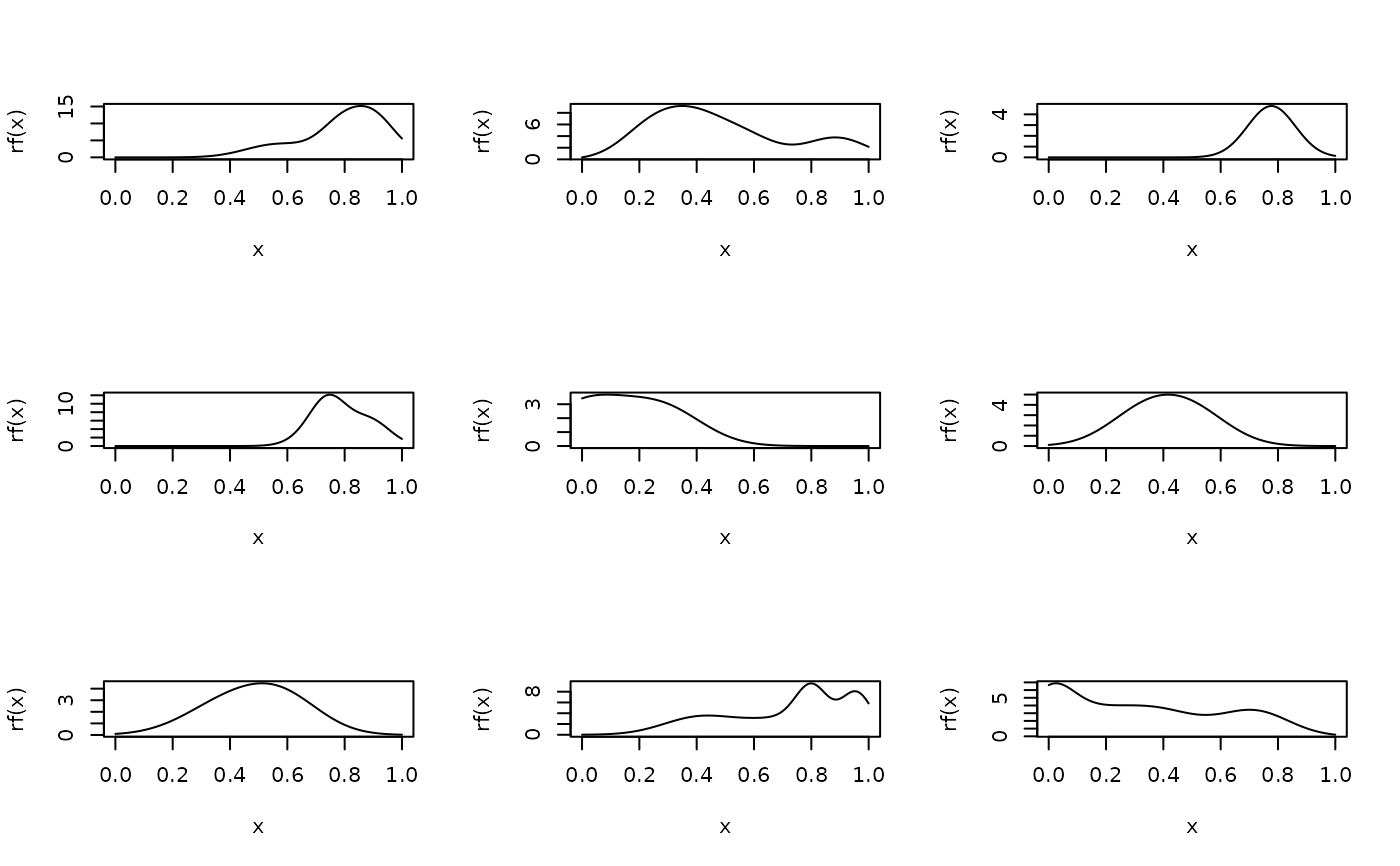 par(mfrow=c(3,3));for (i in 1:9) plot(x,rf(x),type="l",xlab="x")