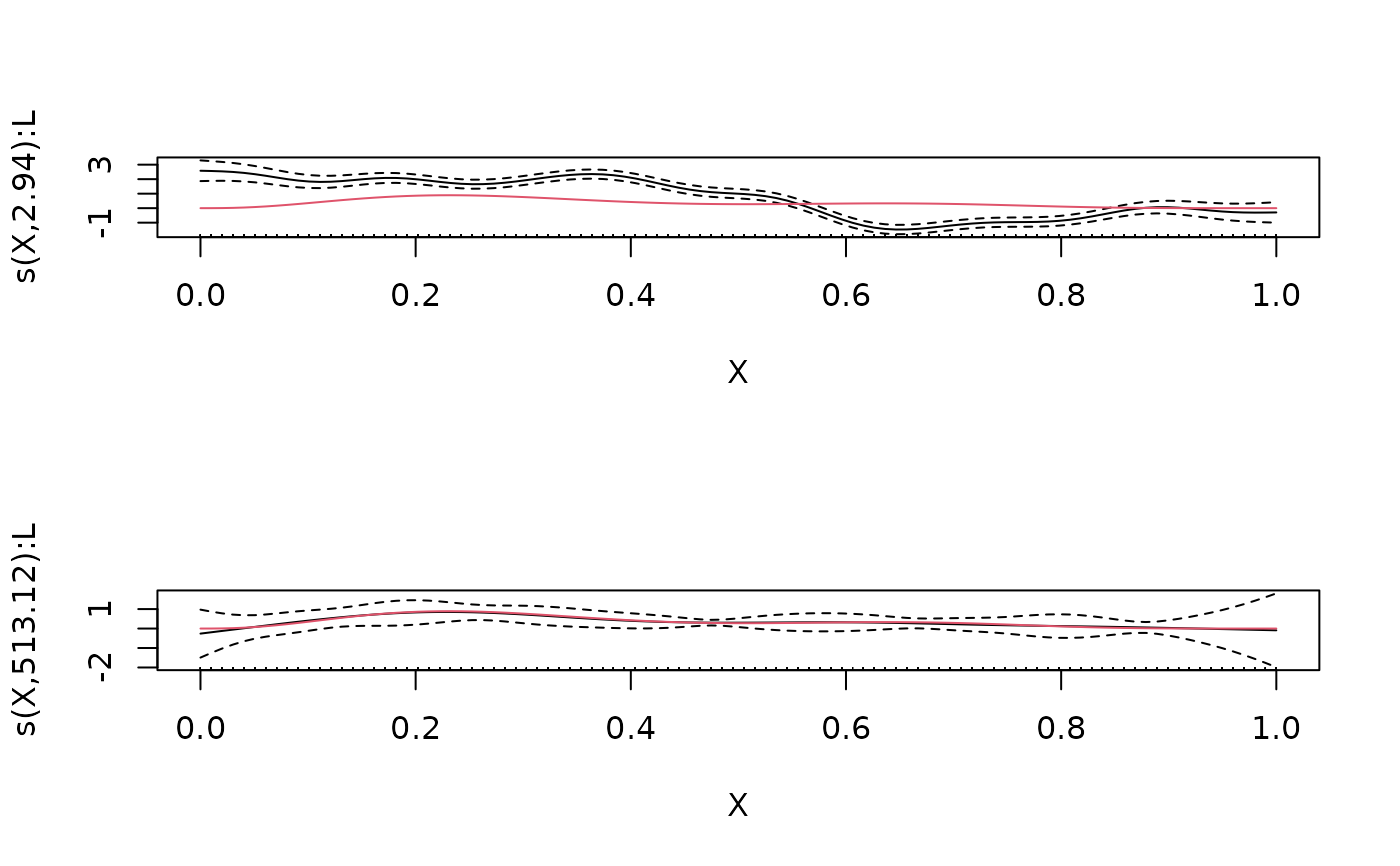 b <- gam(y~s(X,by=L,k=20),method="REML")