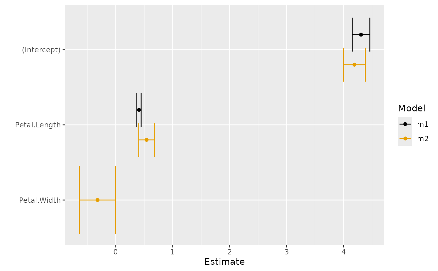 plotEst(..., intercept = TRUE, par = NULL, colors = NULL)One or more models. Currently, lm, glm, geeglm,