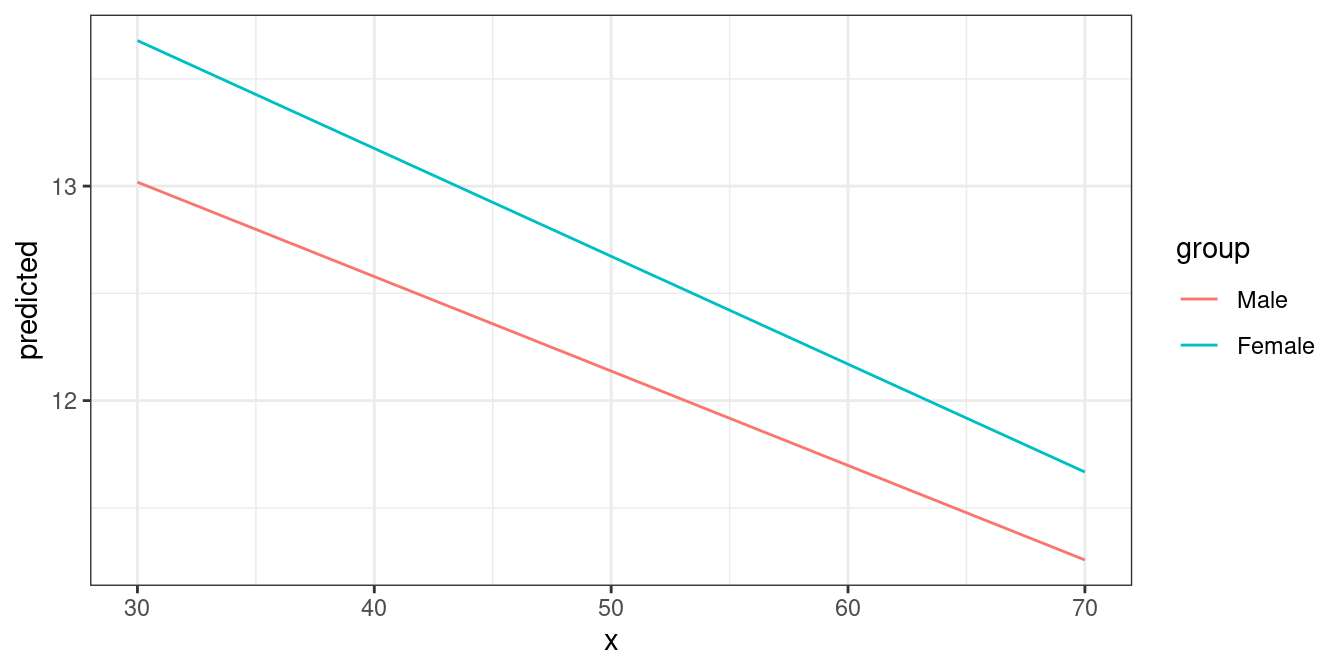 #> [1] "fit"Here we show examples of interaction terms, however, this section applies in general to using many focal terms. You can plot up to five focal terms. For all of these examples, you can easily use the plot()-method. ggplot2 is just used to show how to create plots from scratch.