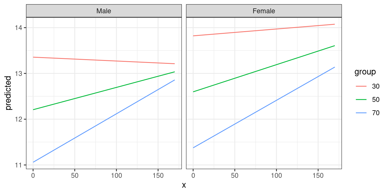 mydf <- predict_response(fit, terms = c("barthtot [30,50,70]", "c161sex"))