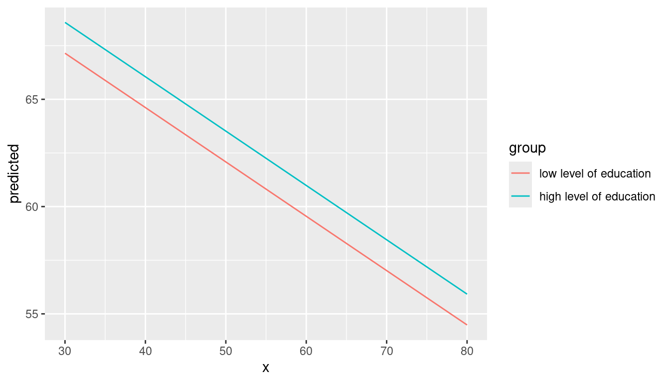 introduction_effectsatvalues.RmdThis vignettes shows how to calculate adjusted predictions at specific values or levels for the terms of interest. It is recommended to read the general introduction first, if you haven’t done this yet.