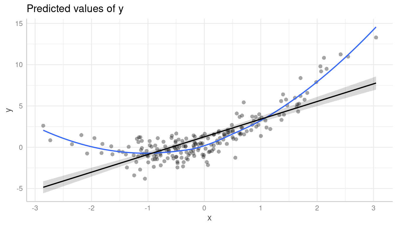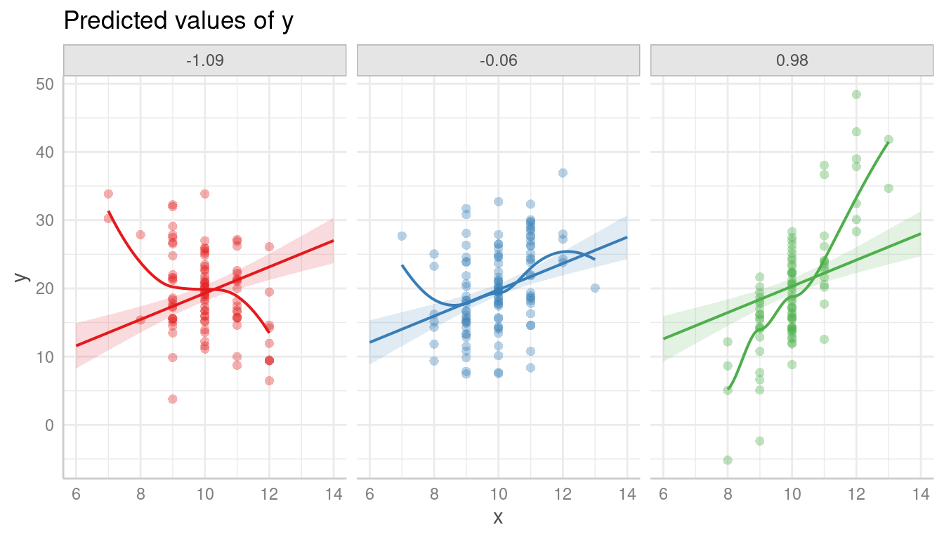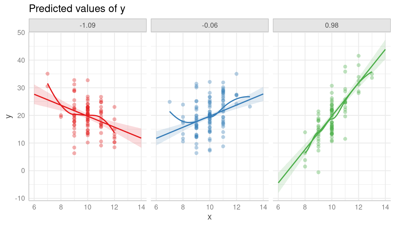 introduction_partial_residuals.RmdPlotting partial residuals on top of the estimated marginal means allows detecting missed modeling, like unmodeled non-linear relationships or unmodeled interactions. In a nutshell, it allows Visualizing Fit and Lack of Fit in Complex Regression Models with Predictor Effect Plots and Partial Residuals (Fox & Weisberg 2018).