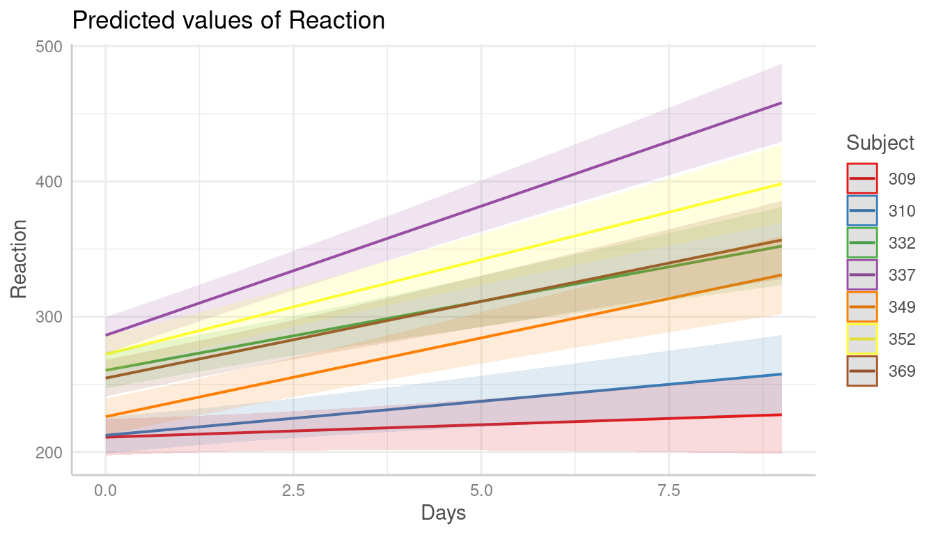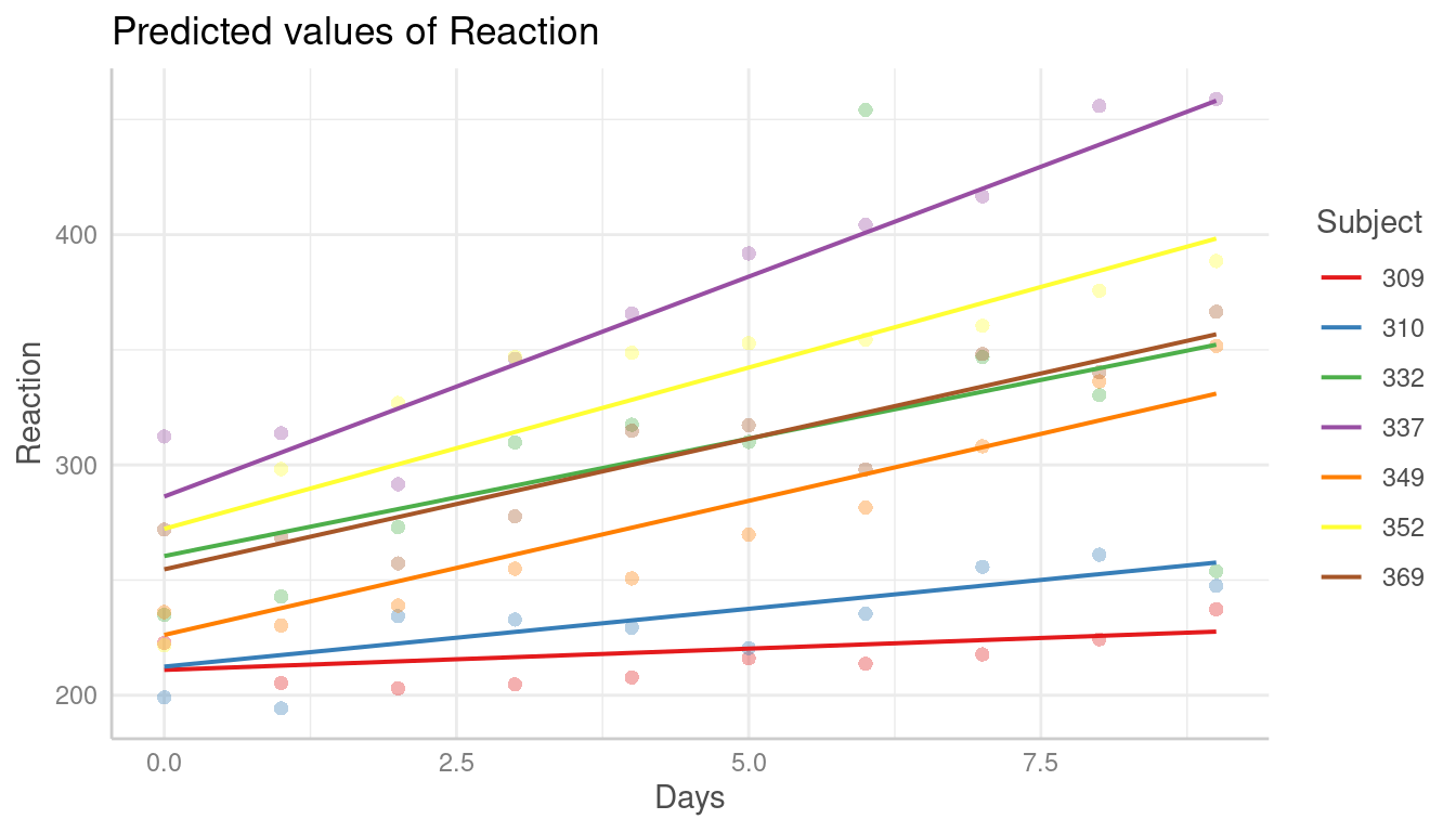 me <- predict_response(m, terms = c("Days", "Subject [sample=7]"), type = "random")