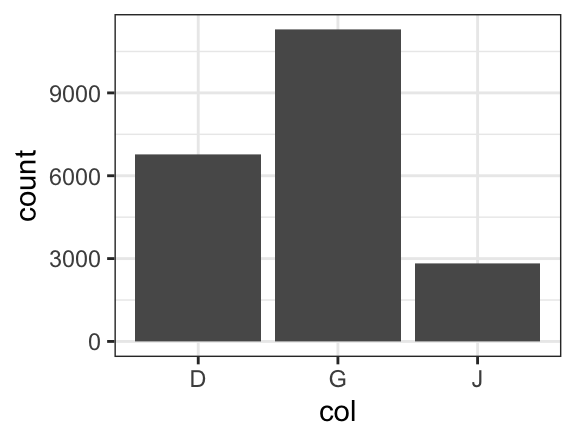 diamonds %>% filter(color %in% c("D", "G", "J")) %>% mutate(col = as.character(color)) %>% gf_bar( ~ col)