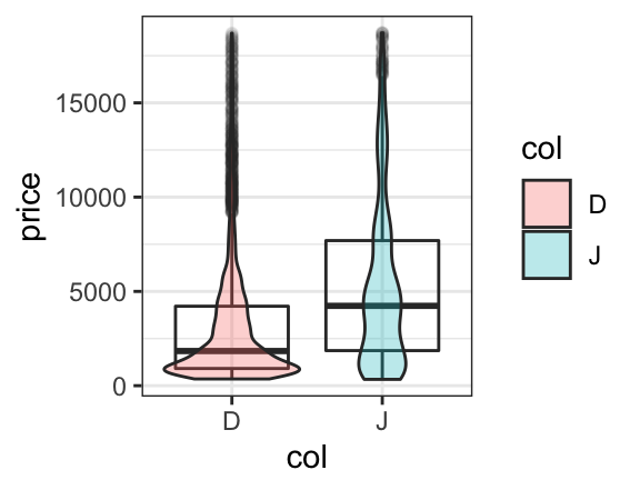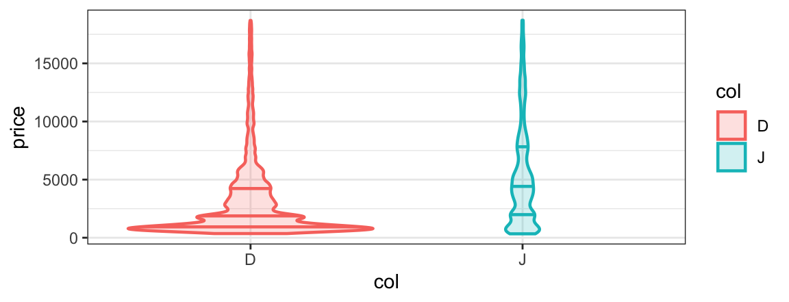 gf_boxplot(price ~ col, data = diamonds2) gf_violin(price ~ col, data = diamonds2)