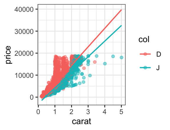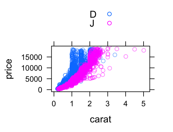 xyplot(price ~ carat, groups = col, data = diamonds2, auto.key = TRUE, type = c("p", "r"), alpha = 0.5) gf_point(price ~ carat, color = ~ col, data = diamonds2, alpha = 0.5) %>% gf_lm(price ~ carat, color = ~ col, data = diamonds2, alpha = 0.5)