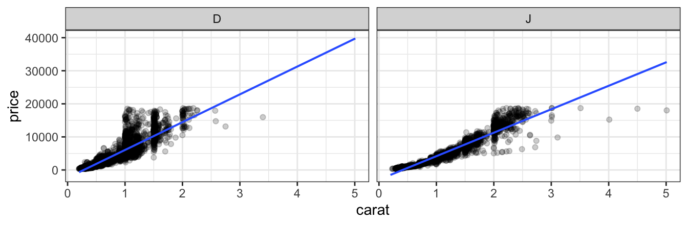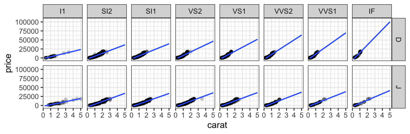 gf_point(price ~ carat, data = diamonds2, alpha = 0.2, size = 0.5) %>% gf_lm(alpha = 0.5) %>% gf_facet_wrap( ~ color) gf_point(price ~ carat, data = diamonds2, alpha = 0.2, size = 0.5) %>% gf_lm(alpha = 0.5) %>% gf_facet_grid( color ~ clarity)