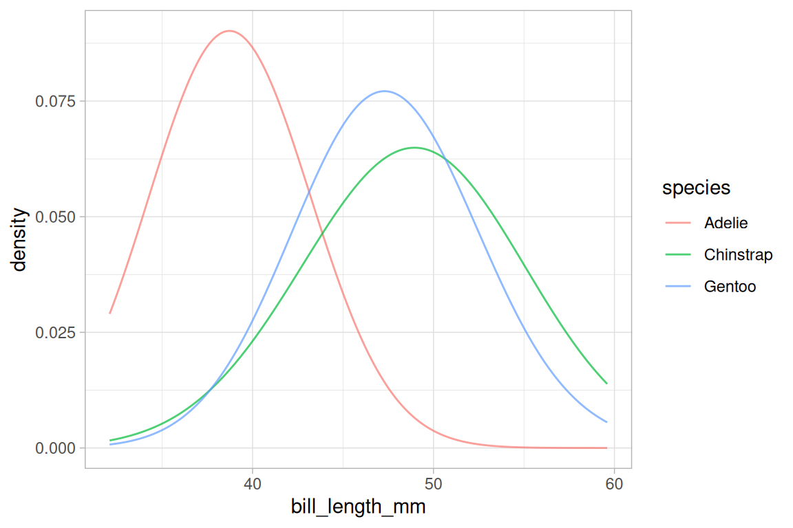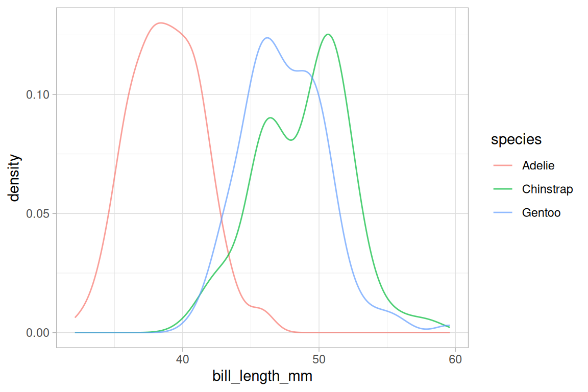 gf_dens(~bill_length_mm, color = ~species, alpha = 0.7, data = penguins)