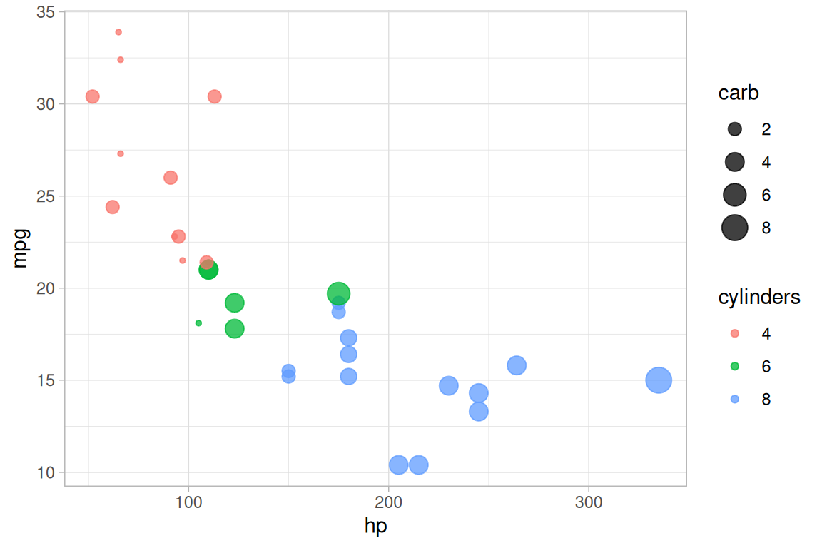 gf_point(mpg ~ hp, color = ~cyl, size = ~carb, alpha = 0.50, data = mtcars)