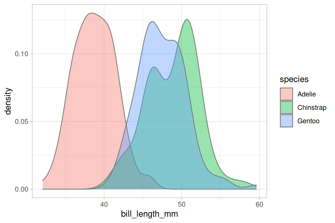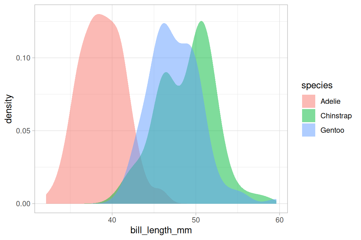 gf_density(~bill_length_mm, fill = ~species, alpha = 0.5, data = penguins)