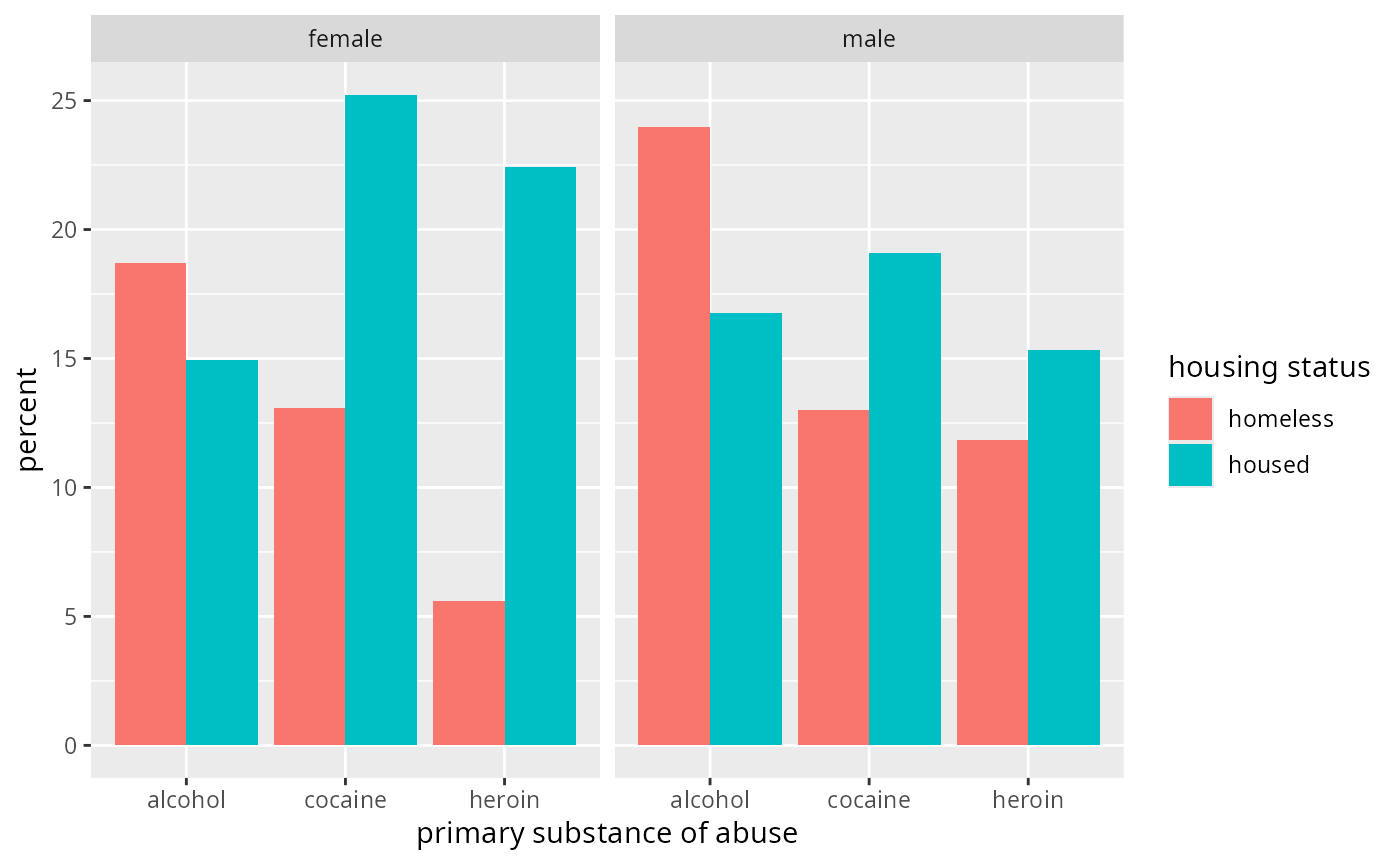 ~ x. (y ~ xis also possible, but typically using one ofgf_col(),gf_props(), orgf_percents()is preferable to using this formula shape.) Faceting can be achieved by including|in the formula.- data
